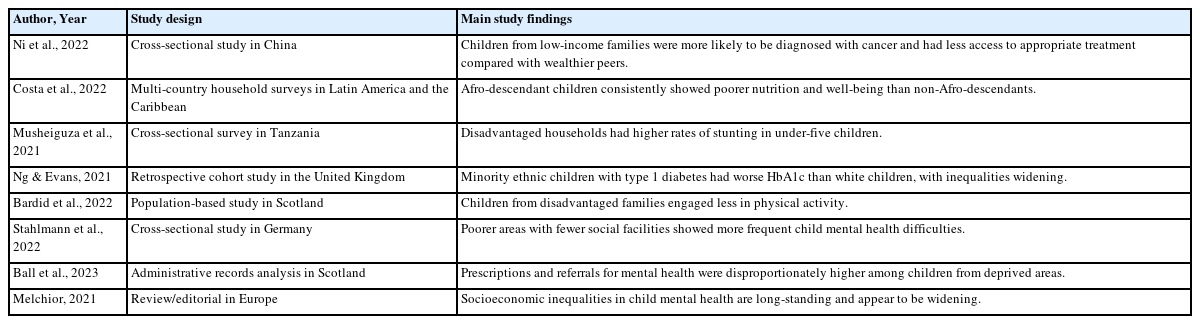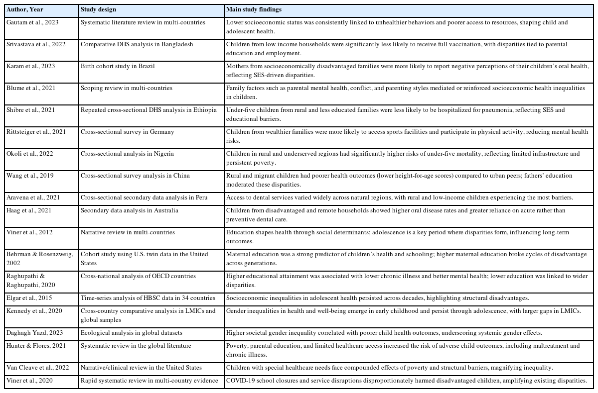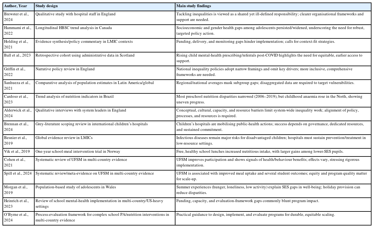 Health inequalities stem from long-standing socioeconomic, geographic, and educational disparities that have shaped child health outcomes for decades (McCartney et al., 2019). Addressing such structural determinants is essential for developing durable strategies to reduce disparities in child health outcomes. Key studies underpinning these conclusions, including study designs and succinct findings, are summarized in Table 3.