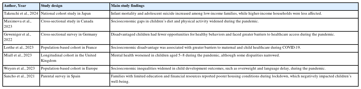 Evidence from multiple regions shows that the pandemic amplified the effects of socioeconomic disadvantage. In Japan, infant mortality and adolescent suicide rose among low-income families, while wealthier households were less affected (Takeuchi et al., 2024). Similar patterns were observed in Canada, where gaps in children’s diet and physical activity widened during school closures (Maximova et al., 2023). European studies also report that disadvantaged children faced greater barriers to maintaining healthy behaviors and accessing healthcare throughout the crisis (Geweniger et al., 2022; Lorthe et al., 2023).