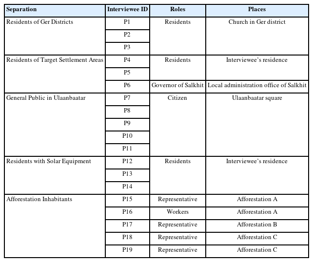 Semi-structured interviews were conducted with ger district residents, target settlement areas, and the general public in Ulaanbaatar. These interviews offered qualitative insights into local challenges—including heating practices, education, and water quality—and helped identify residents’ needs and expectations for sustainable villages. In addition, interviews were held with households that had already installed solar equipment, in order to assess the practical feasibility of solar energy adoption. The diversity of interviewees, including their roles and locations, is reflected in Table 1, which outlines the composition of participants across different resident groups.