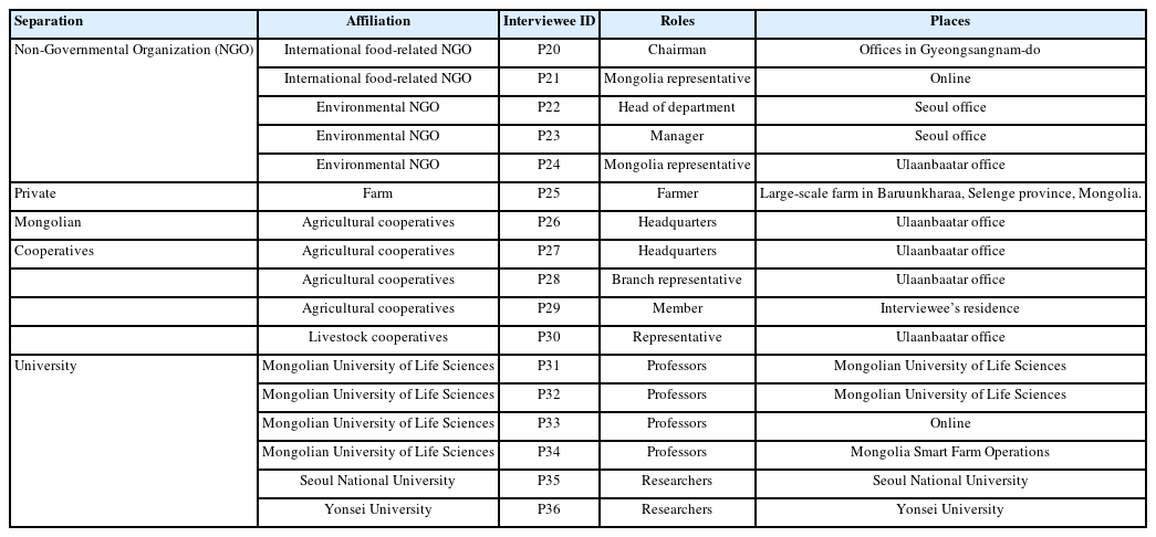 In-depth interviews were conducted with a range of experts and practitioners from the Mongolian University of Life Sciences, the Han-Mongolian Urban Cooperation Center at Seoul National University, Mongolian agricultural cooperatives, non-governmental organizations (NGOs), and a large-scale farm located in Baruunkharaa, Selenge Province, Mongolia. The interviews focused on the current status and challenges associated with implementing agricultural cooperatives, afforestation initiatives, and settlement-based agriculture and livestock projects. Drawing on the institutional experiences of each organization, the interviews explored both the practical possibilities and limitations of introducing these models. As summarized in Table 2, the interviewees represented a diverse set of institutions and roles across academia, NGOs, cooperatives, and the private sector.