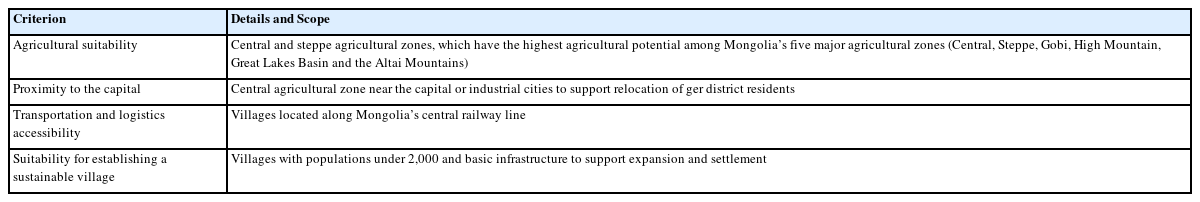 To address the previously identified challenges and implement appropriate solutions, a suitable site for a sustainable village in Mongolia was selected. Table 5 outlines the selection criteria and the corresponding scope of candidate sites.