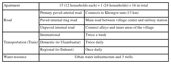 The settlement of Salkhit can be broadly divided into one central commercial area and three residential neighborhoods. The commercial area, located in the center of the town, includes the railway headquarters, public facilities, schools, and apartment complexes, while the residential area consists mainly of privately owned homes. Table 7 shows physical status information of Salkhit, including apartments, roads, transportation, and water resources.