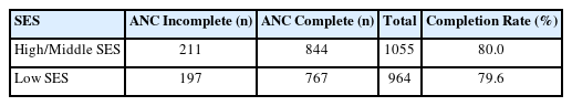 Among the 2,019 women included in the analysis, antenatal care (ANC) completion rates were similar across socioeconomic groups. The ANC completion rate was 80.0% among women in the high/middle socioeconomic status (SES) group and 79.6% among those in the low SES group (Table 1).