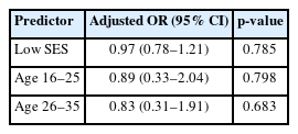 Multivariable logistic regression analysis did not identify statistically significant associations between individual-level demographic characteristics and ANC completion (Table 3). After adjustment, women in the low SES group had similar odds of ANC completion compared with those in the high/middle SES group (adjusted OR = 0.97; 95% CI: 0.78–1.21; p = 0.785). Maternal age group was likewise not significantly associated with ANC completion. Variance Inflation Factor (VIF) values for all predictors were below 2, indicating no evidence of multicollinearity.