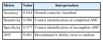 A K-Nearest Neighbors (KNN) classification model was applied to distinguish be-tween completed and incomplete ANC visits using SES and maternal age group as predictors. Class imbalance was addressed through up-sampling during 10-fold cross-validation. The optimized KNN model (k = 15) achieved an accuracy of 54.4% and an area under the receiver operating characteristic curve (AUC) of 0.491, indicating limited discriminative capacity. Sensitivity for identifying completed ANC visits was 58.6%, while specificity for identifying incomplete ANC visits was 37.7% (Table 4). The ROC curve approximated the diagonal line, and the confusion matrix showed substantial misclassification of incomplete ANC visits (Figures 1 and 2).