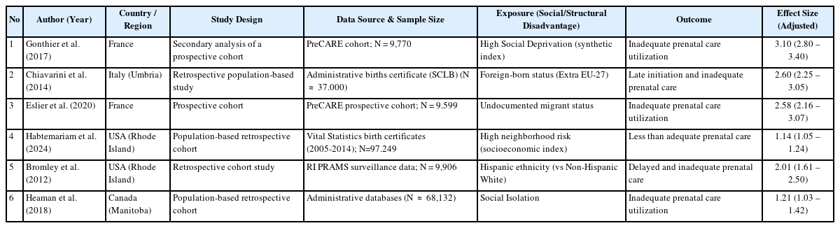 For the systematic review, eligible studies comprised observational research in-volving pregnant women from socioeconomically disadvantaged populations and reporting outcomes related to antenatal care utilization, access to maternal healthcare services, or related measures of social vulnerability. Studies were required to report adjusted effect estimates to be included in the quantitative synthesis.