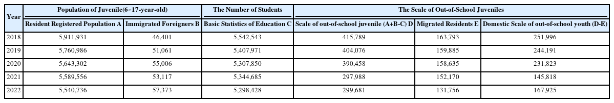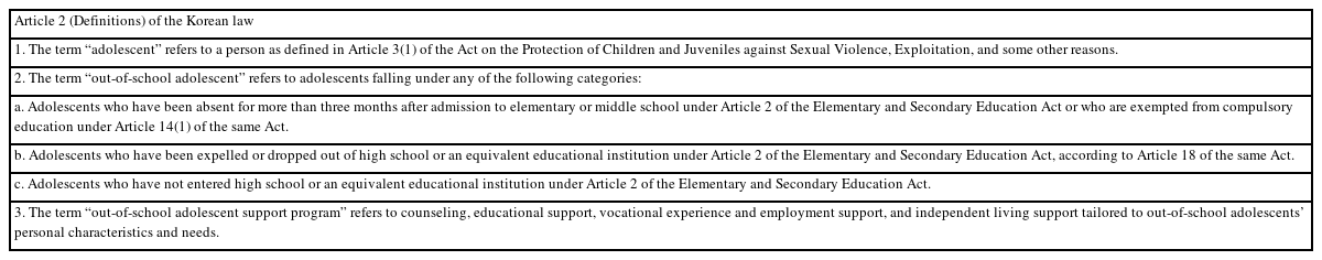 In this paper, distinguishing between the terms “out-of-school youth” and “dropout” is essential. While these terms may seem synonymous, out-of-school youth refers to all adolescents who have decided to leave school. In contrast, dropout specifically refers to those who have discontinued their studies. Therefore, out-of-school youth include dropouts, and it is crucial to make this distinction to define the research objectives clearly [Table 1] (Korea Law Information Center, 2024).