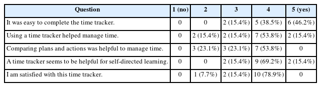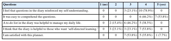 The reasons for participating in the test varied, but the most common reason was “hope to try time management” (85.7%). “To make an efficient study plan (64.3%)” was the highest motivation for participants. Rarely, “interested in your project (28.6%)”, “to overcome depression (21.4%)”, and “not satisfied in an ordinary diary/planner (14.3%)” followed.