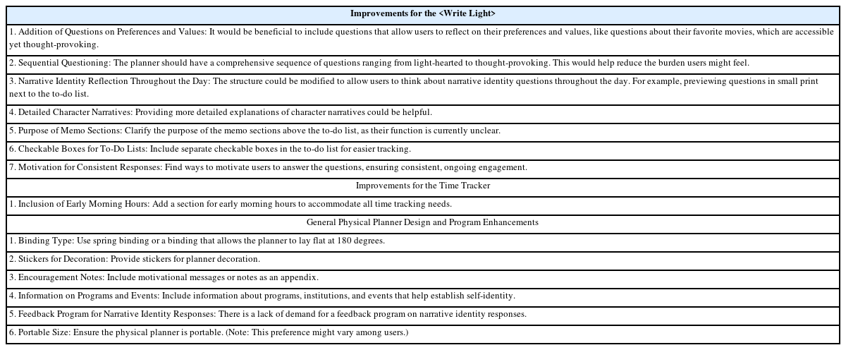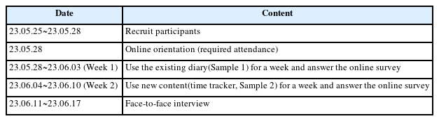 In 2023, a user test was conducted to develop a new <Write Light> version. The purpose of this test was to verify the usability of the planner, expand its target audience from out-of-school youth to general youth, and validate and supplement the necessary content. The user test was conducted over two weeks, from May 28 to June 15, 2023, with 13 university students in their early twenties who participated to improve their daily lives. During the first week, the participants used the existing narrative planner and evaluated their satisfaction and areas for improvement. In the second week, they tested a new feature, the time tracker. The detailed experimental schedule is as follows.