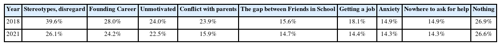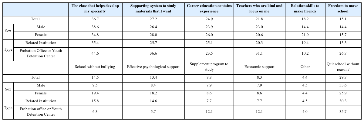 The following table presents the survey results on support measures that could have prevented students from dropping out. The main reasons for dropping out were the lack of classes that could utilize their talents and the absence of support services related to what they wanted to learn. This issue can be attributed to Korean schools' overly standardized, test-focused culture. Therefore, there is a need to expand support for specialized high schools, such as arts and sports schools, and vocational high schools, such as Meister High School. This approach suits students who prefer nonacademic career paths and can function as a social safety net for those who prioritize employment due to their economic background. Therefore, the expansion of specialized and vocational high schools should be pursued alongside the development of higher education pathways such as “posteducation employment.”