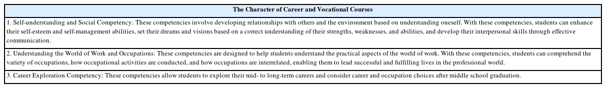 Korea’s career education tends to be overly focused on vocational education. Therefore, we emphasize the importance of self-understanding through the formation of a narrative identity. In career and vocational education classes, self-understanding is often inadequately addressed. The first unit of the <Career and Vocational> course typically addresses self-understanding, and excerpts from the textbook emphasize the importance of understanding one’s characteristics in career education [Table 7-8](National Curriculum Information Center, 2022).