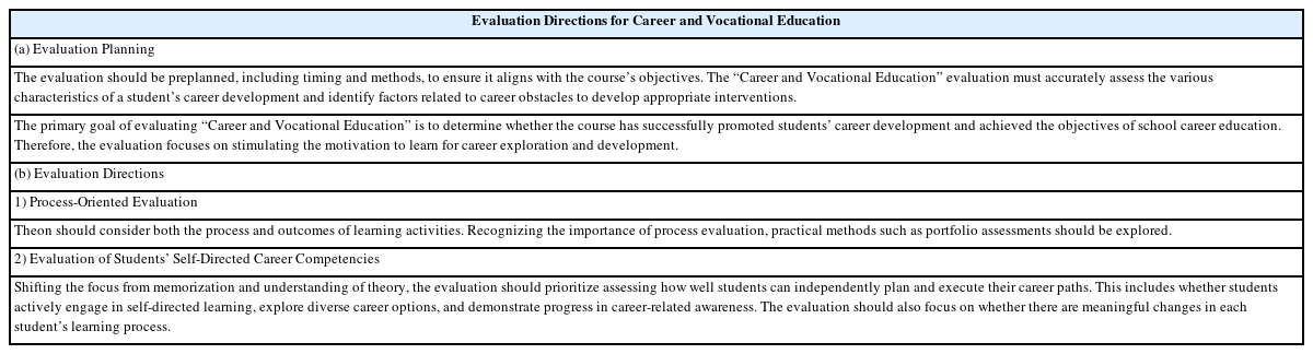 Compared with that in other countries, career education in South Korea is highly structured. As of April 2016, 96.6% of the schools had career counselors, with a goal of 100% placement in all schools. Most middle and high schools establish career education plans and budgets, and students engage in various career exploration and experiential activities through ‘career activities’ in creative experience programs and elective subjects such as ‘Career and Occupation’. The national curriculum guidelines have increasingly emphasized career education, with the 2015--2022 revised curriculum guiding schools to organize and operate career-centered education programs.