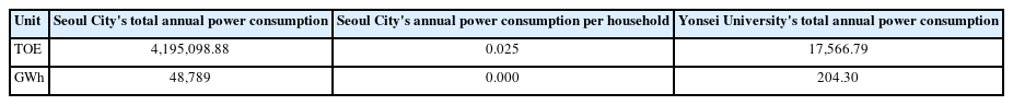 Table 10 compares the total annual electricity consumption of Seoul, the annual electricity consumption per household in Seoul, and Yonsei University’s total annual electricity consumption (based on the Seoul Statistics Information System, 2022). Yonsei University accounts for approximately 0.4% of Seoul's total electricity consumption. When compared to the annual electricity consumption per household in Seoul, Yonsei University's consumption is significantly larger, making this contrast immediately evident.