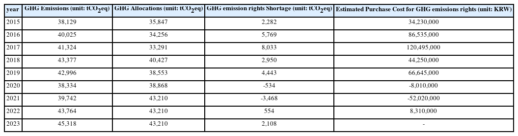 GHG Emissions, Allocations, Shortage of GHG Emission Rights, and Estimated Purchase Cost of GHG Emission Rights, During 9 Years (2015–2023), based on Statement, in Yonsei University Sinchon Campus