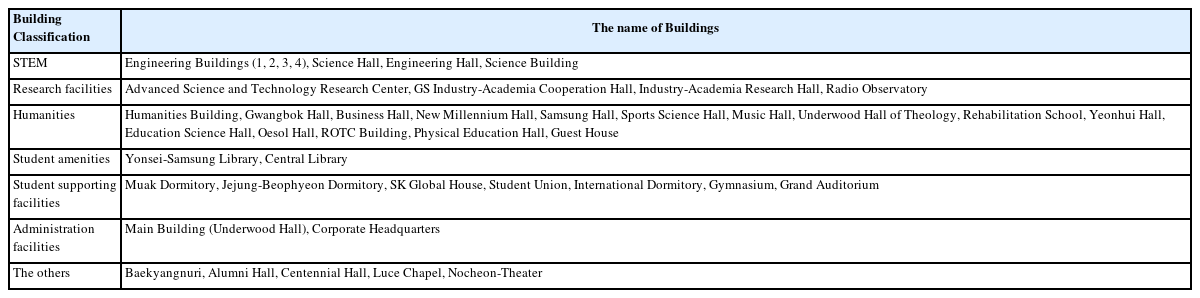 Table 2 and Table 3 present the overall status of Yonsei University's Sinchon Campus and the building classification method used in this study. As of April 2024, the Sinchon Campus comprises approximately 54 buildings with a total floor area of 633,651 m2. To analyze energy usage patterns by building characteristics, the buildings were classified into seven categories: STEM (science, technology, engineering, mathematic), humanities, research facilities, academic support facilities, student amenities, Student supporting facilities, administrative facilities, and the others.