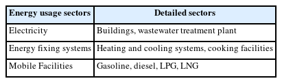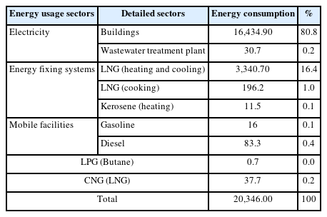 Table 4 and Table 5 categorize the energy consumption and GHG emissions of Yonsei University's Sinchon Campus into three sectors. This categorization facilitates the understanding and analysis of energy usage and GHG emission patterns. Table 4 presents the categorization of energy consumption into three sectors used in this study: electricity, energy fixing systems, and mobile facilities. Officially, electricity includes consumption in buildings and wastewater treatment plants. Energy fixing systems cover heating, cooling, and cooking powered by LNG and kerosene, while mobile facilities encompass transportation powered by gasoline, diesel, LPG, and CNG.