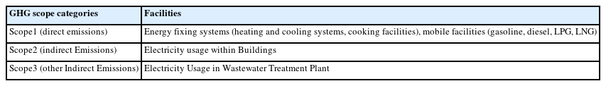 Direct emissions (scope1) refer to emissions from sources that are directly managed and controlled by the emitter, such as production facilities and vehicles owned and operated by Yonsei University. scope2 and scope3 encompass indirect emissions from facilities not owned by the emitter. Scope2 represents GHG emissions generated during external electricity production, which the emitter cannot directly control. In this study, scope2 includes only electricity consumption in on-campus buildings. When it comes to scope3, this study considers only the electricity usage for operating the on-campus wastewater treatment plant within scope3. While scope3 conventionally extends to include the entire chain, encompassing emissions from waste, commuting, business travel, and external vehicles, the estimation of these emissions is highly complex and uncertain.