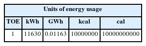 Table 6 outlines the relationships between various energy consumption units. In this study, the unit TOE (Tonne of Oil Equivalent) will primarily be used. TOE is a standardized energy unit based on the calorific value of one tonne of crude oil, enabling the conversion of various energy sources expressed in units such as kl, t, m³, and kWh into a common measure. Wh(Watt-hour) represents the energy consumed when 1 joule of energy is used per second for one hour. 1kWh (Kilowatt-hour) equals 1,000 Wh, and 1GWh (Gigawatt-hour) equals 1,000 kWh. For GHG emissions, the unit tCO2eq (tonne of CO2 equivalent) is used uniformly. Although GHG emissions include various gases such as CH4, N2O, and HFCs, it is common practice to express them as CO2 equivalents (CO2eq) by converting the emissions of other gases to their CO2 equivalence. CO2 accounts for 94.4% of South Korea’s annual GHG emissions, justifying this standardization (Environment Statisitcs Portal, 2024).