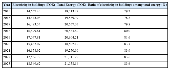 Firstly, total energy consumption has been increasing. Specifically, electricity usage in buildings accounted for 80.8%, while energy fixing systems using LNG (heating/cooling) accounted for 16.4%, together representing 99% of the total energy consumption. Therefore, maximizing the use of renewable energy sources and improving the energy efficiency of buildings is essential. Subsequently, strategies to reduce the use of natural gas (LNG) should also be explored.