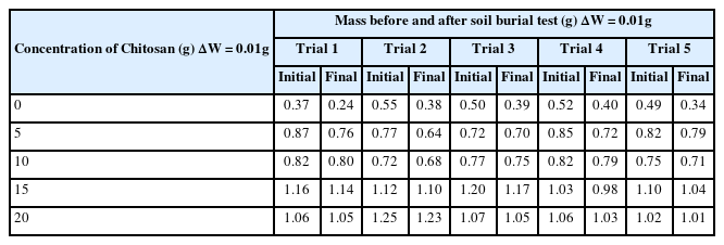 It can be seen in this experiment that chitosan acts as a biodegradation inhibitor as a way to increase bioplastic durability. The decrease of weight loss of bioplastic after the soil burial test (as seen in Figure 2) indicates that there is less biodegradation. Without checking the bioplastic’s weight, it was already evident that the bioplastic had less biodegradation due to its appearance. The bioplastics with higher concentration of chitosan retained its shape and color while those with lower concentration appeared to have decreased in size and had a duller color. This is supported by research done by Dewi et. al. (2023) wherein they tested the effect of additional bioplastic and cellulose on the performance of bioplastic. Their results on the effect of chitosan on biodegradation of bioplastic is that it made it stronger and it took longer to decompose. This is due to chitosan having antibacterial properties and this makes the material resistant to decomposing microorganisms found in soil.