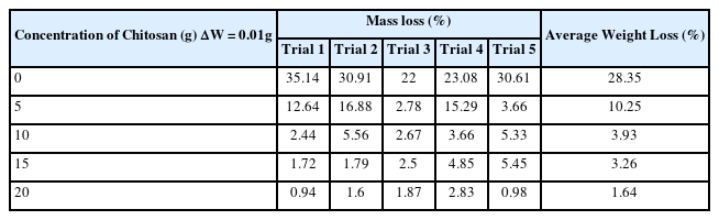 Concentration of Chitosan, Mass Loss in Percent for Each Trial, and Average Mass Loss of Each Increment in Newton