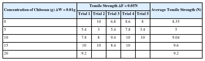 For additional analysis on the effect of chitosan on the properties of chitosan, the tensile strength was measured using a spring balance. Though not directly related to the research question, it is a good indicator to see if it can compare synthetic plastic’s durability.