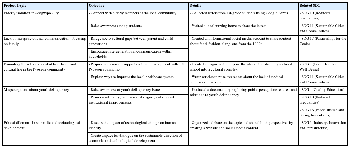 The program is significant in that it adopted self-directed educational methods into ESD by integrating career education. The inclusion of self-reflection and discussion in classroom activities encouraged student participation and engagement. In addition, student-led projects empowered students to engage in self-directed learning by analyzing community issues and creating feasible solutions. Through these approaches, the program offered students an opportunity to actively reflect on the SDGs and develop their career aspirations based on an understanding of a sustainable society. In addition, it allowed students to exert their influence as subjects leading positive change and to confirm the role of future generations in community development.