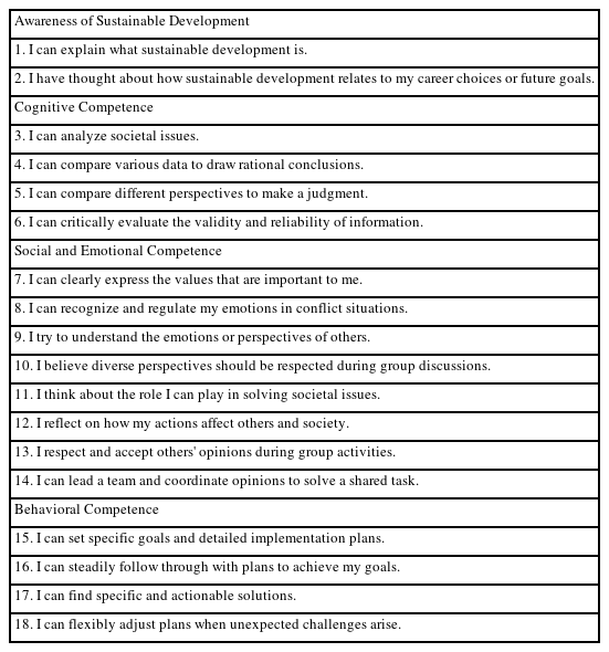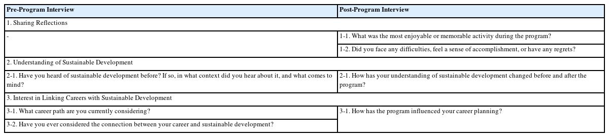 Focus group interviews were conducted to explore changes in 'awareness of sustainable development' in greater depth. Two students from each class were randomly selected to form a group of ten, and pre-program and post-program interviews were conducted to identify shifts in responses. The interviews were conducted by three researchers of the program, with the pre-program interview lasting approximately 15 minutes and the post-program interview around 50 minutes. The interview questions explored two key areas: understanding of sustainable development and interest in linking careers with sustainable development as detailed in Table 3.