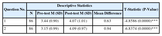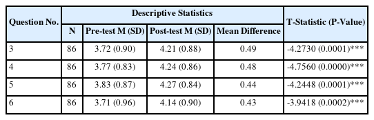 For the quantitative analysis, pre- and post-surveys consisting of 18 questions were administered to 124 participating students to assess changes across the four categories. The full set of survey questions is listed in Table 2. Survey responses were recorded on a 5-point Likert scale, and paired sample t-tests were conducted to determine statistically significant differences.