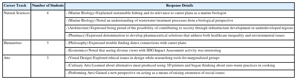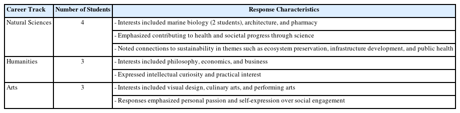 When asked about their intended career paths, students expressed a range of aspirations across disciplines including marine biology, philosophy, and visual design. Their responses on the motives of such interests often reflected personal experiences or media influence. We categorized students’ career paths based on three domains — natural sciences, humanities, and arts. Among these groups, students pursuing careers in the natural sciences demonstrated a clearer awareness of its relevance to sustainability, as reflected in specific references to “infrastructure development in developing countries through modular architecture.” In contrast, students in the humanities and arts tracks generally expressed weaker or no explicit connections between their career goals and sustainable development. The details of the responses are presented in Table 8.