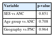 Chi-square analysis indicated no statistically significant association between SES and ANC completion (p = 0.851). Bivariate analyses further showed no significant associations between ANC completion and maternal age group or geographic indicators where available (Table 2).