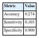 The gradient boosting model yielded an AUC of 0.503, indicating no meaningful improvement in classification performance relative to chance. The confusion matrix demonstrated high specificity (90.0%) but low sensitivity (10.3%), reflecting pre-dominant classification into the majority outcome category (Table 5; Figures 3 and 4). The low overall accuracy observed in this model is attributable to the use of aggressive up-sampling strategies to address class imbalance, which altered class distributions during model training and evaluation and prioritized sensitivity to minority outcomes over raw classification accuracy.