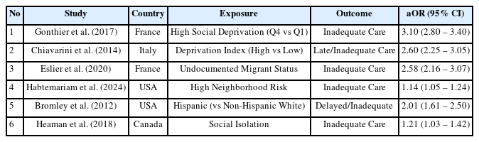 For the systematic review, eligible studies comprised observational research in-volving pregnant women from socioeconomically disadvantaged populations and reporting outcomes related to antenatal care utilization, access to maternal healthcare services, or related measures of social vulnerability. Studies were required to report adjusted effect estimates to be included in the quantitative synthesis.