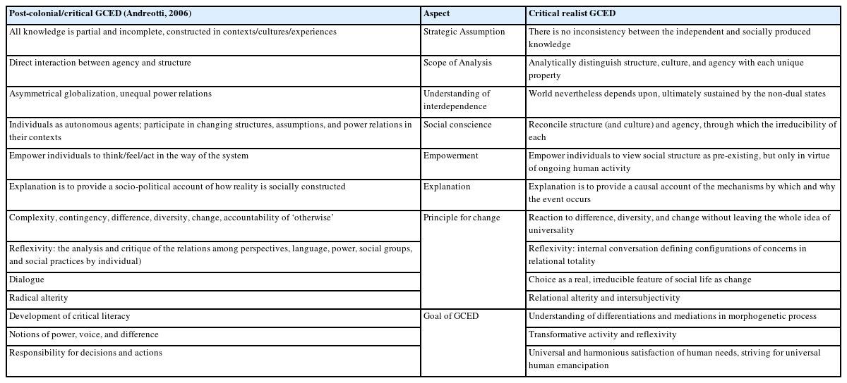 By analytically distinguishing social systems and citizens at different levels, this provides a device for examining their causal mechanism, rather than reducing them to mere interaction. This ontological vantage point includes conceptual shift in such as interconnection, objectivity, subjectivity, internal relationality, universality or totality. Objectivity and subjectivity both emerge in the relation and presuppose sociality. In this sense, critical realist approach can be distinctive from post-colonial/critical approach (Table 1). Post-colonial/critical perspective on GCED emphasizes difference and diversity. It views society as a verb, ongoing process, and as always in flux. Each of individuals is engaged in a complex series of collectivity through exchange of diverse perspective. In contrast, critical realist says we are different, if we do not split or alienate ourselves from our universal structure (‘essential unity’) as human beings with others (Vandenberghe, 2014). That underlying unity is what the critical approach dismisses, or the lack of authentic notions of truth or objectivity. The critical realist approach is distinctive in accepting citizenship with ‘intersubjectivity’ of collective entities. It thematizes the specificity of both group interest and individual identity, without downgrading the idea of the essential unity of humanity, particularly concerning the global crisis, as our interconnection has become striking. Therefore, it aims to uncover the mechanisms of interplay among different powers and reconstruct the complex globalized society (Vincent & O’Mahoney, 2018).
