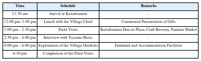 Before and after the interviews, we visited various local institutions with the assistance of Toyama Shota. Den-en Plaza in Kawabamura is equipped with facilities that can delight not only the residents of Setagaya but also many tourists. Notably, a farmer market where locally grown produce is sold, a craft brewery, and a blueberry farm exist. We were able to closely examine the village’s administrative practices and identify the key factors contributing to Kawabamura’s success. Detailed descriptions of each facility are provided later. The schedule of the field trip is as follows [Table 1].