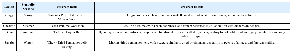 Consequently, the four selected regions—Seongju, Cheongdo, Gumi, and Sangju—each represent a different season within the theme park: spring, summer, autumn, and winter, respectively. Their populations are 40,000, 40,000, 400,000, and 90,000. We designed a variety of programs based on each theme to be experienced in these regions. Below is the information about the programs [Table 2].